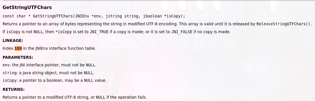 we will find it mapped to GetStringUTFChars if we search by 169 - when this function pointer called it,s convert string data at pointer to utf8 string and lVar2 will hold result if (lVar2 != 0) mean return if converting failed , lVar2 will be NULL in this case : return if IVar2 = 0x00000000000