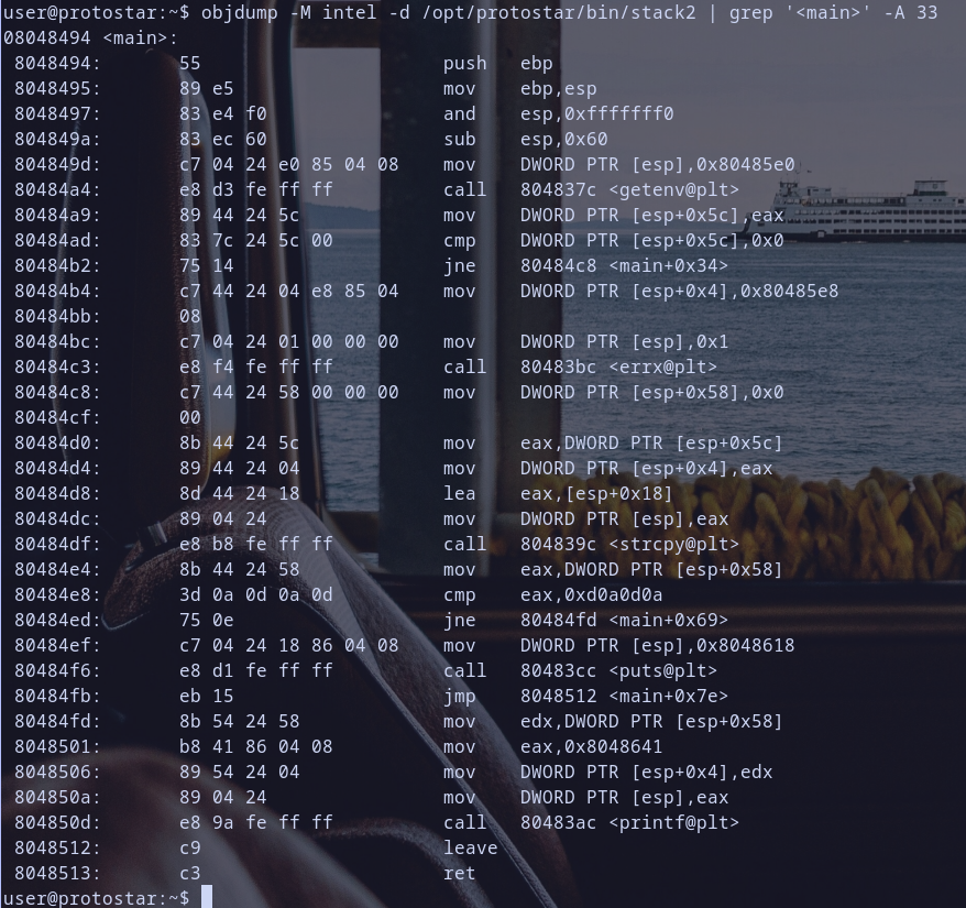 objdump -M intel -d /opt/protostar/bin/stack2 | grep '<main>' -A 33