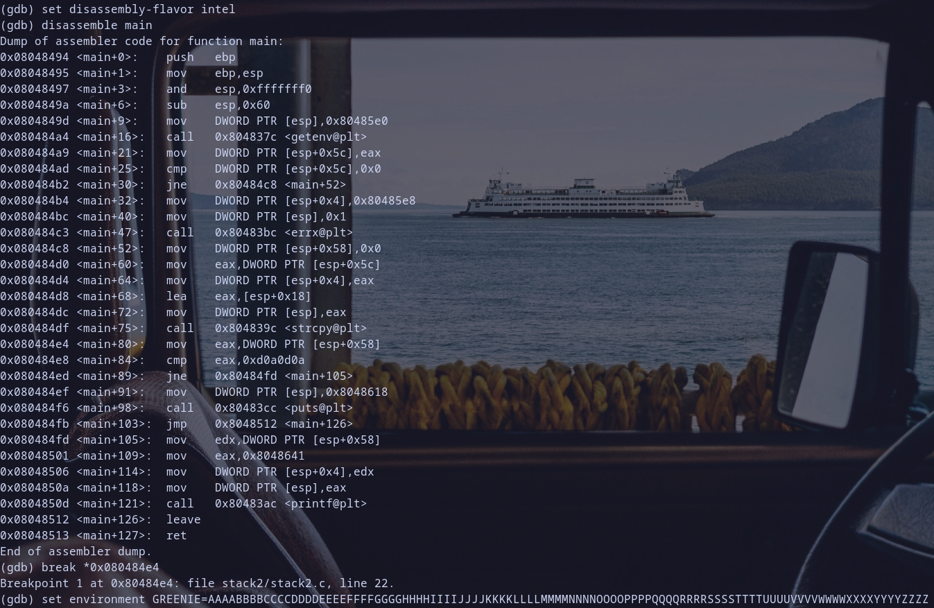 getenv:mov DWORD PTR [esp], 0x80485e0: set the argument forgetenvwhich as we see while exploreing the binary above , the environment variable calledGREENIE.call 804837c <getenv@plt>: call thegetenvfunction and store the result ineax.mov DWORD PTR [esp+0x5c], eax: store the result in the local variable at[esp+0x5c].