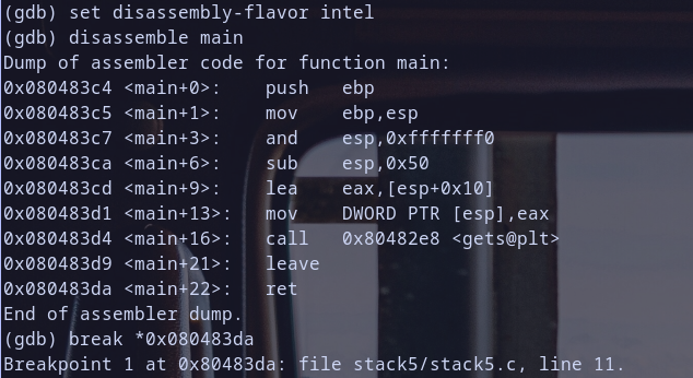 lea eax,[esp+0x10]: load effective address of[esp+0x10]noweaxis pointer for =>[esp+0x10]mov DWORD PTR [esp],eax: storeeaxinesppointer mean at the top of stack, so iteaxvalue is just was an arg forgetsfunctioncall 0x080482e8 <gets@plt>: callgetsfunction , Hmmm Again? Thanks, we love Overflow :D